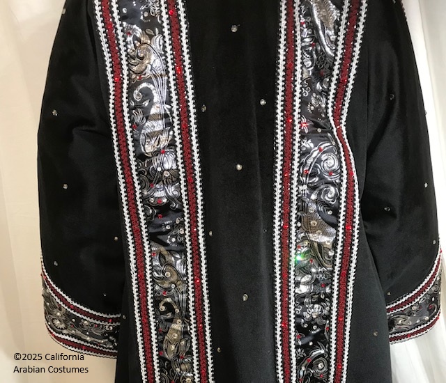 Ideal for the individual who prefers a native costume that is more traditional. The robe is authentic, having been made in the Middle East and the designs are embroidered. Hand sewn pearls and sequins bring the embroidery to dazzling life! It is pretty and hand-crafted to enhance the shapes and designs with tiny crystal aurora borealis added for show ring appeal. This robe is a find so rare, the judges will take a second look for sure! The horse’s blanket leans more to the subdued side and has been designed to show off the splendor of the robe. Pearls and crystals have been individually hand-set to the braid to bring the horse and rider‘s costume together with three-layered tassels made in the same colors that you will see in the robe.