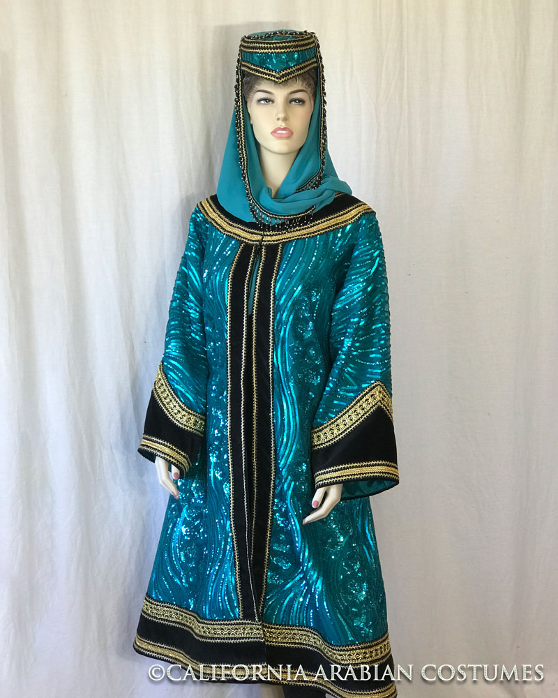Black, Gold and Turquoise Arabian Native Costume. Have you been searching for a native costume that will look stunning on a bay, chestnut or grey? Then, perhaps, you might consider this exquisite beauty? Loaded with lots of sparkle and show ring appeal, and with both style and elegance. The robe is spectacular on its own, but wait until you see the sequin wave design that is built into the fabric! It gives the robe wonderful dimension.